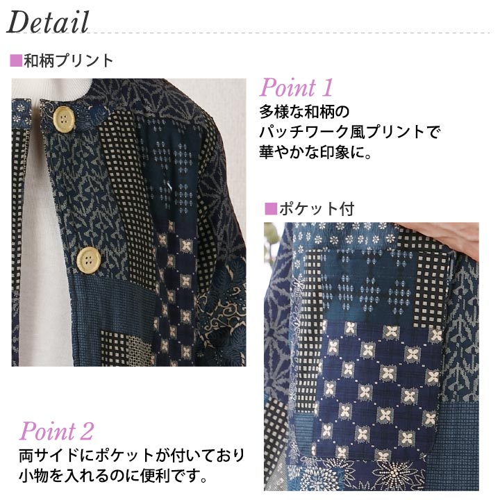 パッチワーク風の和柄プリント! ■■■ スタッフおすすめポイント ■■■ ポイント1 いろいろな和柄プリントがパッチワークで表情豊かに! 紺色がベースになっているので、粋で落ち着いた「和」の一枚に。
