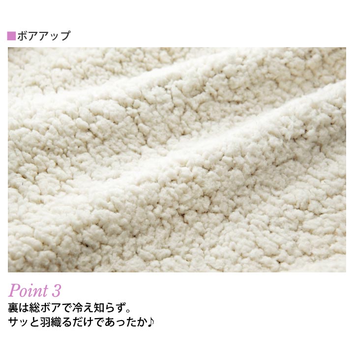ポイント2 大き目のボタンで扱いやすく、お袖も動きやすい長さなので 家事の邪魔にもなりにくく、冬の日のお部屋着としておすすめ! ポイント3 裏は総ボアなので、一枚羽織るとあったか、ほこほこ。
