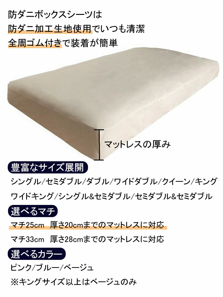 色ピンク、ブルー、ベージュ※キングサイズ以上はベージュのみサイズ展開●シングル●セミダブル●ダブル●ワイドダブル●クイーン●キング●ワイドキング●シングル&セミダブル●セミダブル&セミダブル 備考ボックスシーツのマチとは、マットレスの厚み+底部に敷かれる生地を含めた長さです。