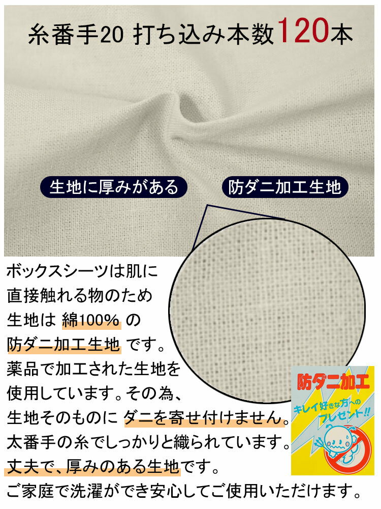 ●ボックスシーツ糸番手20 打ち込み本数120本ボックスシーツは肌に直接触れる物のため生地は綿100%防ダニ加工生地を使用しています。