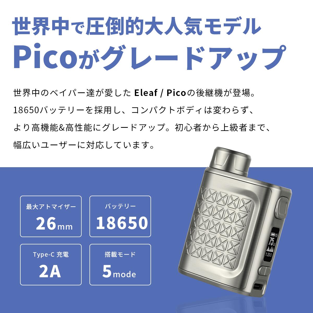 4.アクセサリー ・LG社製 18650バッテリー ・たばこカプセル対応 マルチドリップチップ ・ベプログオリジナルポーチ中サイズ ・ベプログオリジナルユニコーンボトル 【商品の特徴】 <iStick Pico2 MOD> ●あのPicoから待望の後継機が登場! ●より高機能、高性能になり初心者の方から上級者の方までお楽しみいただけます。